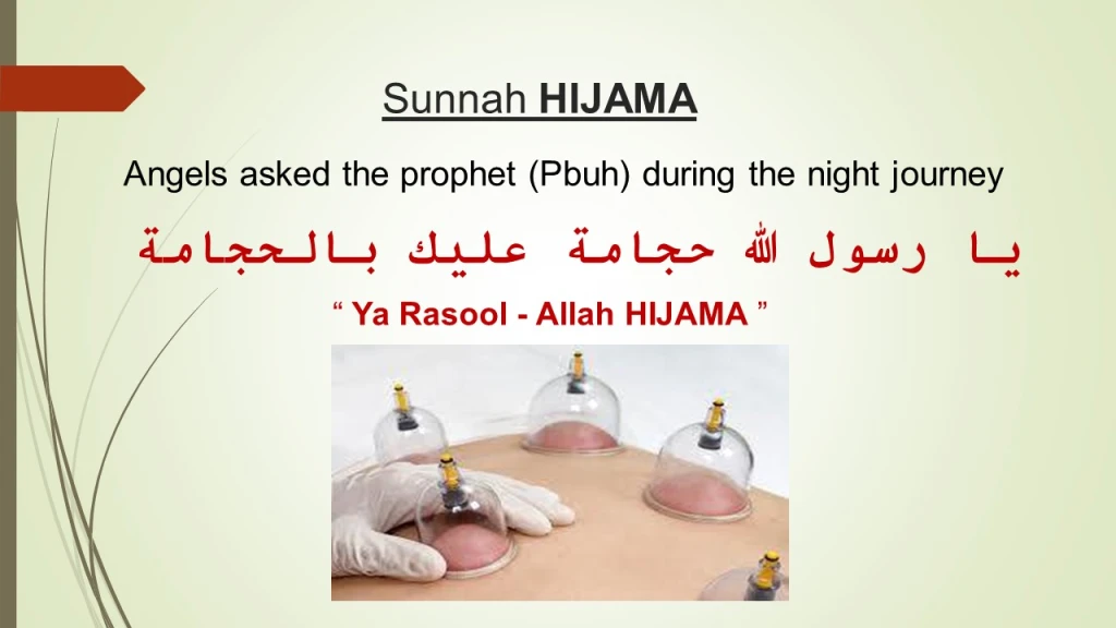 Hijama (cupping) is considered as the Best of Medicines by Prophet Muhammad (PBUH). During the night journey (Meraaj) of Prophet Muhammad (Peace be Upon him), group of angels on every sky asked the Prophet (PBUH) to establish Hijama.